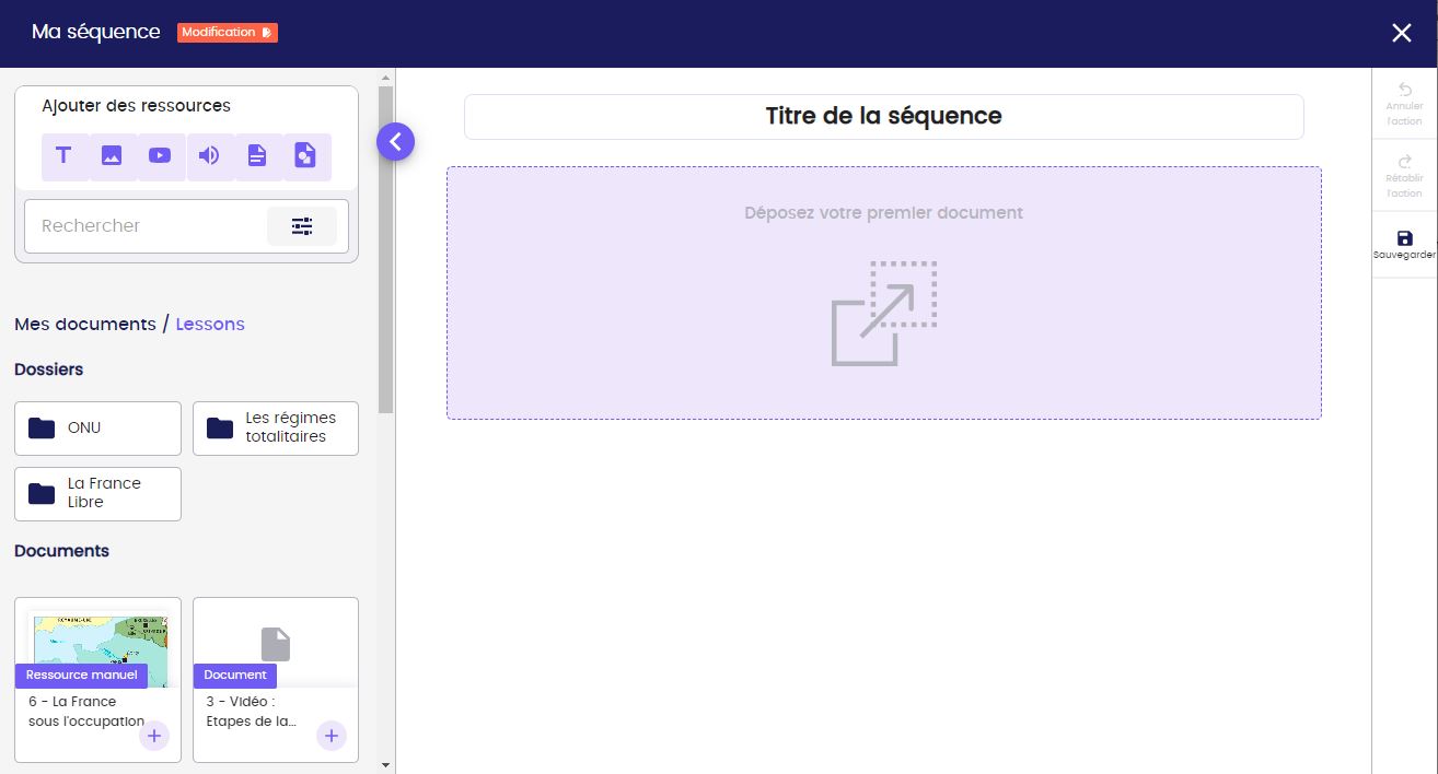 Création de séquence Vous pouvez désormais créer votre propre cours à partir de vos ressources personnelles, d'internet ou celles de vos manuels. Une fois terminé, déroulez-le en classe, exportez-le en PDF ou partagez-le à vos élèves après la séance !
