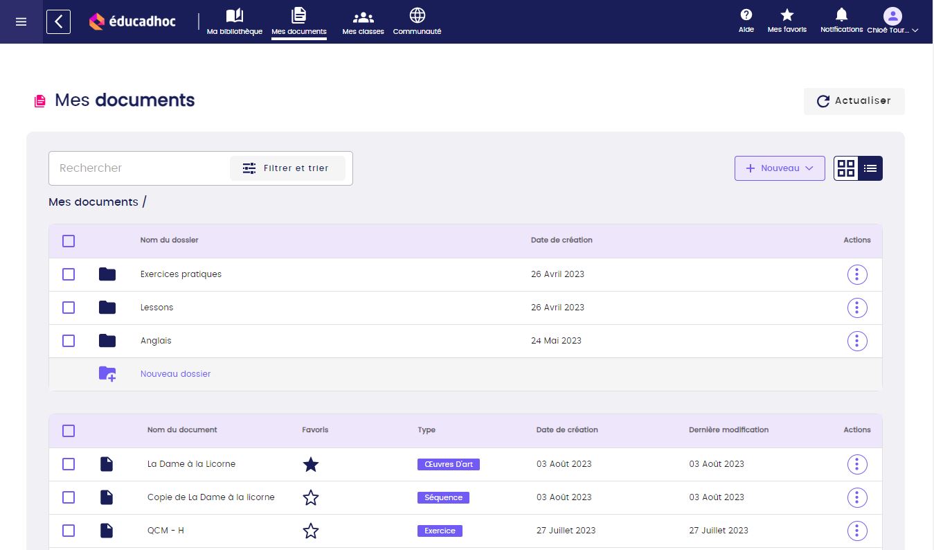 Organisation de ses ressourcesDepuis l'espace mes documents, vous pouvez créer des dossiers pour classer vos ressources importées ou sauvegardées depuis vos manuels. Organisez-les par niveau, thématique, discipline ou classe pour les retrouver et les utiliser facilement !